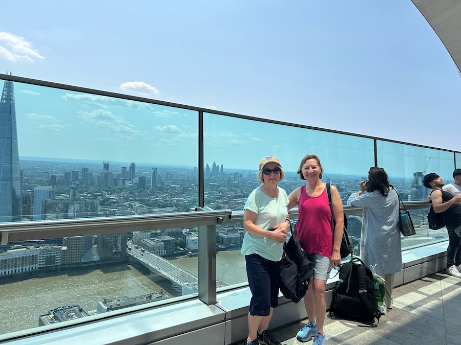As if these breathtaking views were not enough, our excitement grew as we headed to our second viewing tower, this one even higher. So tall we could see it from several blocks away, the skyscraper at 22 Bishopsgate is London’s tallest building. A dedicated high-speed lift whisked us up from the ground level directly to the 58th floor in mere seconds. Here we were treated to Horizon 22, the free two-storey public viewing gallery with floor-to-ceiling glass windows which allowed for unobstructed views for miles of London and even beyond. The views were thrilling, and we were up so high it made us chuckle to see how small the Sky Garden and the London Eye looked from way up there.