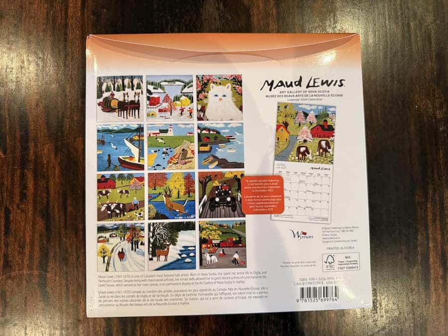 Maud Lewis is my mom’s favourite Canadian artist, so a calendar that you can buy in support of the Art Gallery of Nova Scotia, is a gift that keeps on giving throughout the year for mom. Both Mom and I were delighted to discover that it includes a few pieces of Maude’s art that neither of us had seen before.